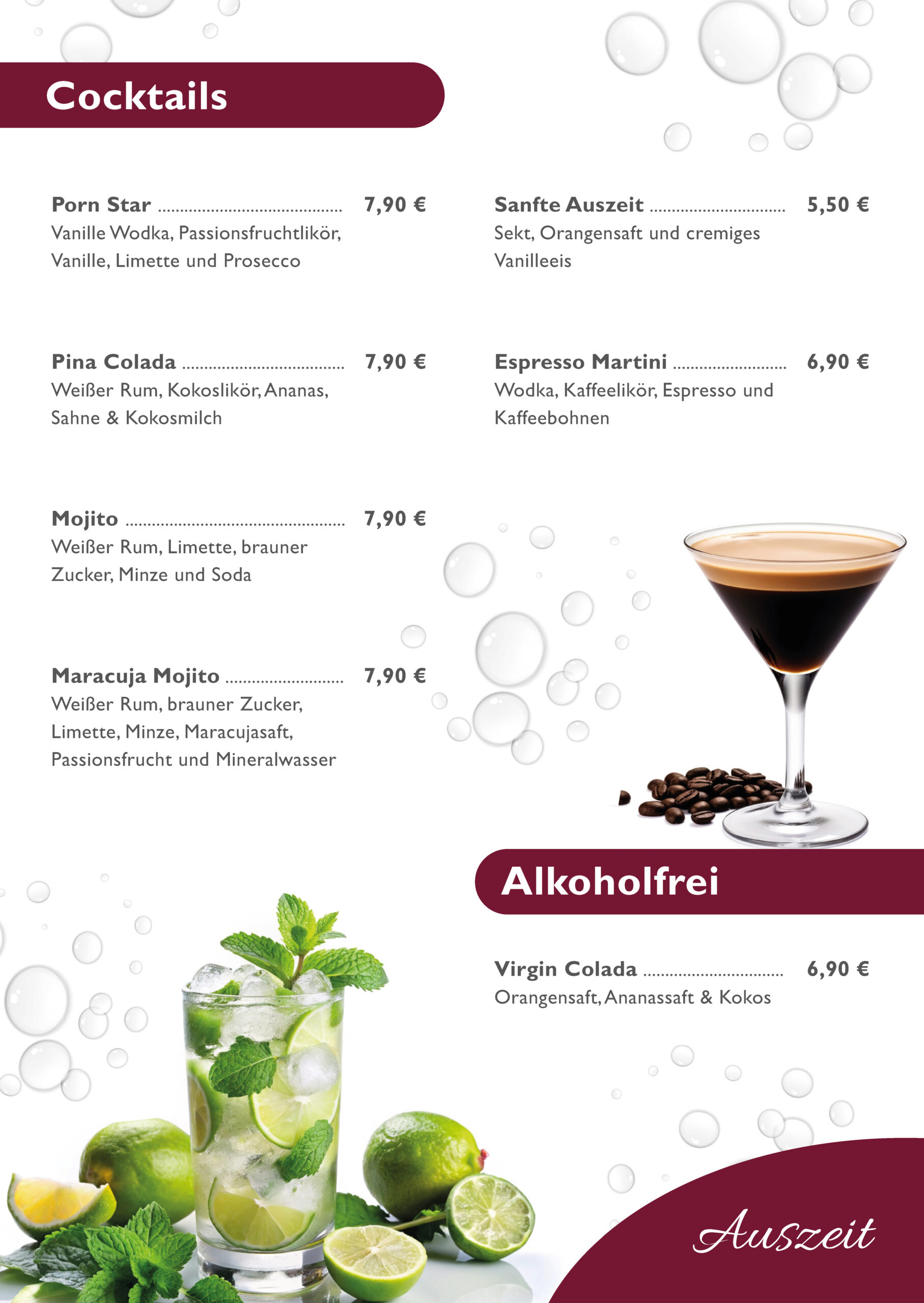 Cocktailkarte ab Januar 2026. Änderungen werden jederzeit vorbehalten.