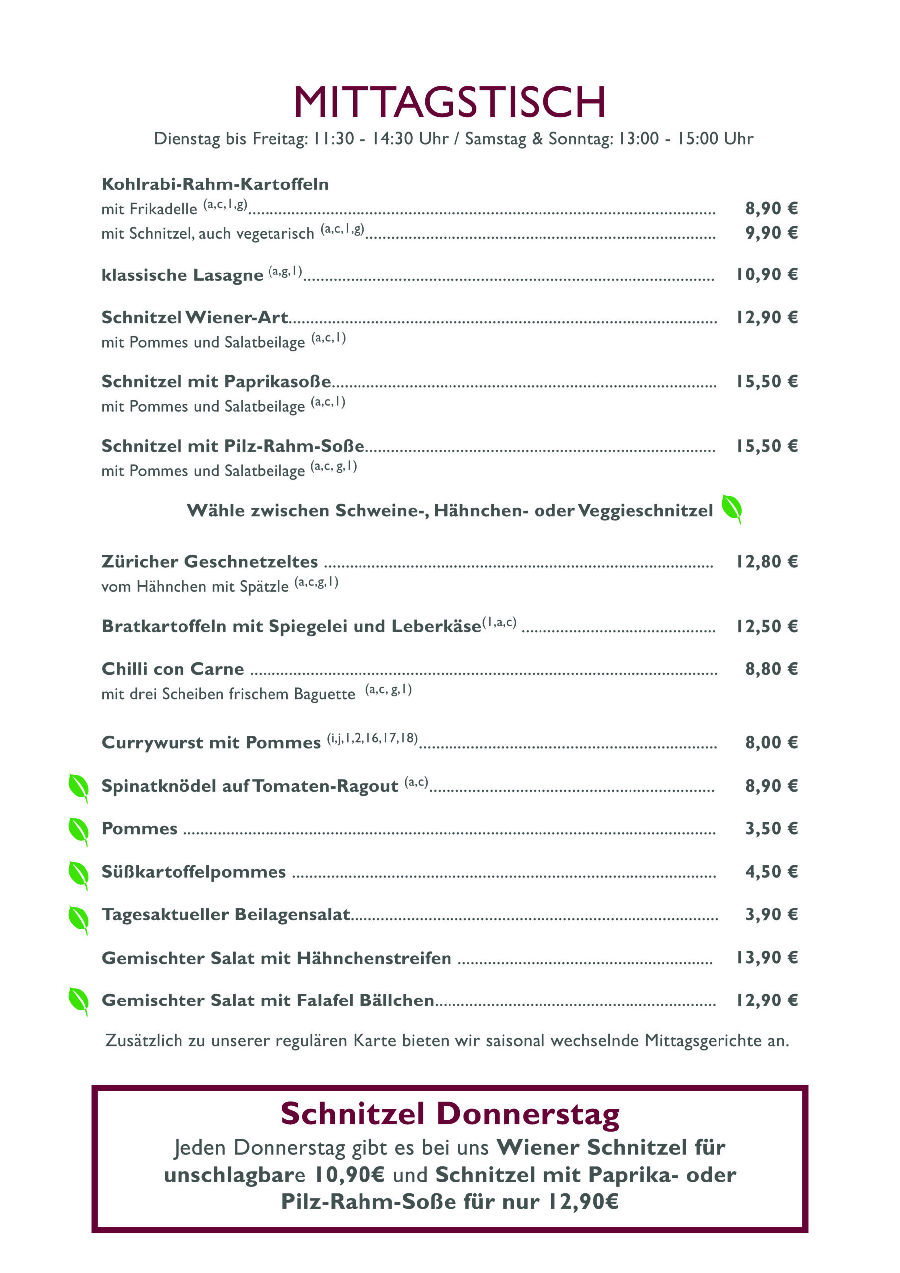 Speisekarte ab April 2025. Änderungen werden jederzeit vorbehalten.